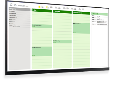 Viser kun vågne timer og kun "I dag", "I morgen" og "i overmorgen" i timevisning - resten følger i en liste. Derudover er min opgaveliste vist til venstre, sammen med klokken samt vejret i 3 timers intervaller.